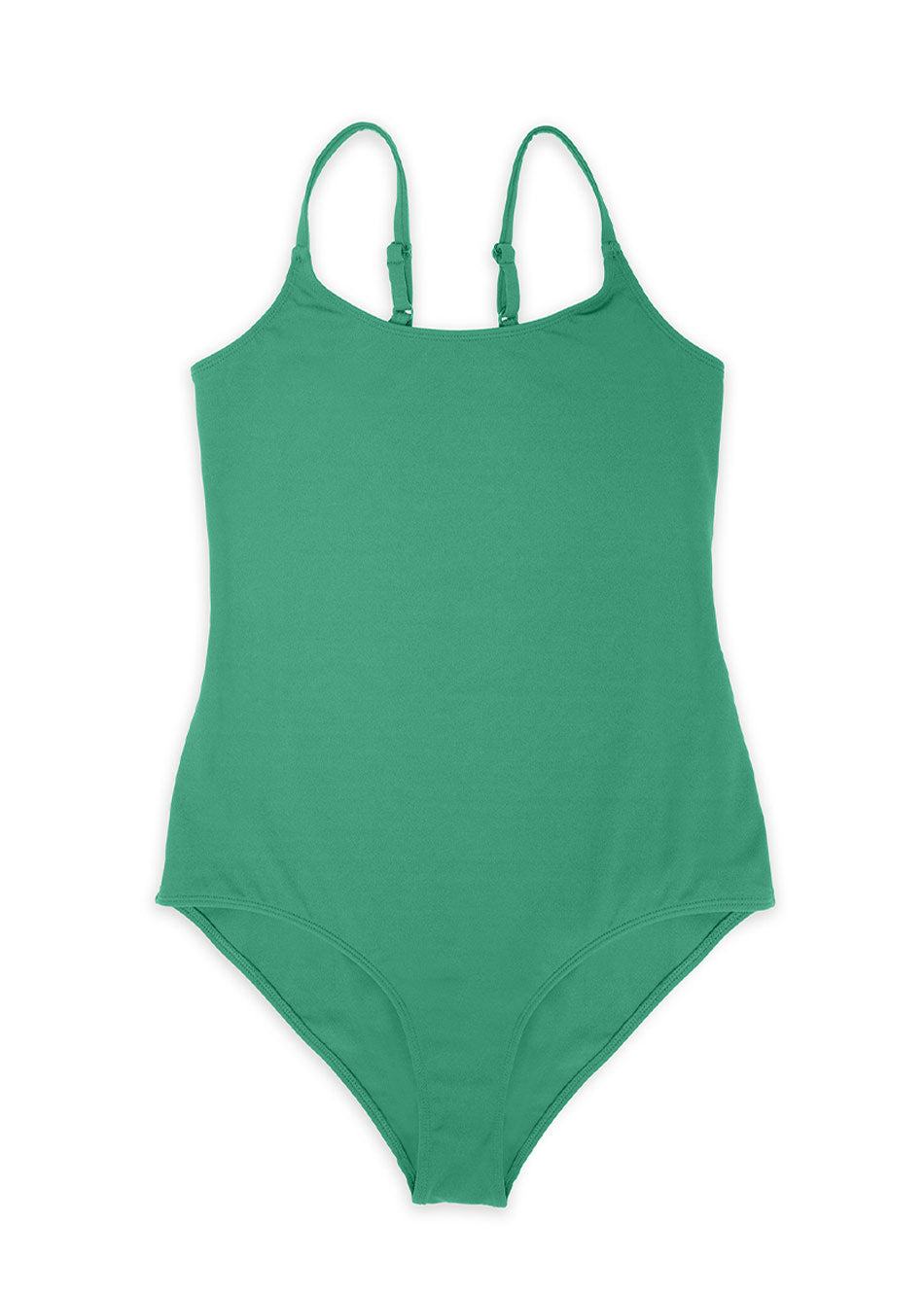 Basic one-piece swimsuit with thin straps and a low back, made from eco-friendly material for teens. Last few pieces available.